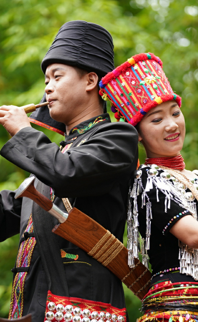 云南壯族主要聚居在文山州,人口114萬,民間的村寨大多依山傍水。壯族擅長種植水稻,有太陽崇拜和長老崇拜的風俗,視銅鼓為重器,厚愛銀飾,善烹制五色花米飯,能歌善舞,熱情好客。進入景區(qū)壯族村,迎面有祭祀龍王的龍柱,兩邊是先民繪制的天王崖畫和為紀念傳說洪水泛濫時幫助先民度過劫難而建的石葫蘆亭。祭祀玉皇大帝的昊天閣和傳說能驅(qū)邪納福的碩大銅鼓聳立在廣場兩側(cè)。桿欄式和麻欄式民居、壯族青年社交休憩的“情廊”、村...